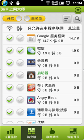 “防火墻”界面集所有信息于一頁(yè)面,對(duì)流量情況和操作得心應(yīng)手:分應(yīng)用統(tǒng)計(jì)流量,分WIFI和2G/3G統(tǒng)計(jì)流量,顯示正在運(yùn)行(綠色應(yīng)用名稱)和正在聯(lián)網(wǎng)(綠色上網(wǎng)符號(hào))的應(yīng)用!便捷的程序流量查找,可按關(guān)鍵字搜索,按WIFI或2G/3G流量大小、按選中、按聯(lián)網(wǎng)狀態(tài)、按運(yùn)行狀態(tài)排序等。