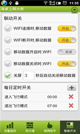 貼心的情景聯(lián)動(dòng),可以設(shè)置“關(guān)屏n秒后自動(dòng)關(guān)閉網(wǎng)絡(luò)”、“連接WIFI時(shí)關(guān)閉移動(dòng)數(shù)據(jù)”等;每日定時(shí)開關(guān),讓網(wǎng)絡(luò)管理更智能化!真的是非常貼心!