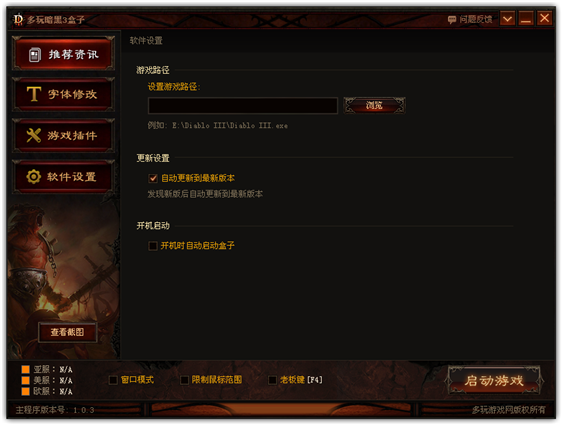 用暗黑3盒子的“啟動游戲”按鈕啟動游戲,就可以在游戲界面右下角看到一個暗黑三盒子的按鈕,點開它,就可以看到詳細(xì)的設(shè)置界面了。