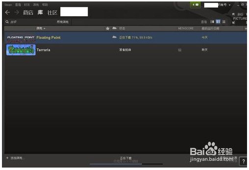 11、點(diǎn)擊頂部“庫(kù)”菜單,看到游戲列表中已經(jīng)有了floating point在下載,下載完后就可以玩了