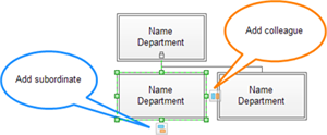 1. 選中一個形狀。2. 點擊左邊的浮動按鈕添加同事。3. 添加底部的浮動按鈕添加下屬。