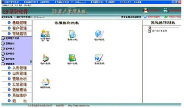 E8客戶管理軟件免費(fèi)版基于先進(jìn)的CRM營銷理念設(shè)計,集客戶檔案、銷售記錄、業(yè)務(wù)往來、業(yè)務(wù)提成自動計算、郵件群(發(fā))、營銷費(fèi)用記錄、客戶反饋記錄等多種功能于一身,以凝聚客戶關(guān)系、提升資源價值為核心,將潛在客戶變?yōu)楝F(xiàn)實(shí)客戶、從而提升銷售量、提高用戶的滿意度,并增加企業(yè)競爭力。E8客戶管理軟件免費(fèi)版采用圖形導(dǎo)航,科學(xué)規(guī)范的業(yè)務(wù)流程,即使不懂軟件的人,只要會點(diǎn)鼠標(biāo)按照提示就能使用。查詢匯總功能強(qiáng)大快捷,打印單據(jù)豐富,可以支持EXCEL數(shù)據(jù)導(dǎo)入、導(dǎo)出,E8客戶管理軟件免費(fèi)版具有可以按客戶、商品、業(yè)務(wù)員、部門等多種銷售排行表的功能,及大的方便了企業(yè)銷售決策。獨(dú)特的通過普通寬帶(如ADSL)連接遠(yuǎn)程數(shù)據(jù)庫,輕松實(shí)現(xiàn)廣域網(wǎng)(互聯(lián)網(wǎng))上數(shù)據(jù)共享操作,為用戶節(jié)省巨大寬帶租用費(fèi)用。