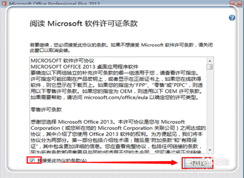 準(zhǔn)備完畢,出現(xiàn)microsoft office2013的安裝許可條款,點(diǎn)擊“我接受此協(xié)議的條款”,然后點(diǎn)擊“繼續(xù)”。