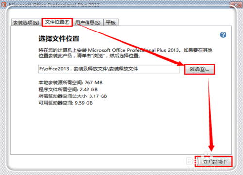 出現(xiàn)安裝文件選項(xiàng),這里進(jìn)入“安裝選項(xiàng)”可以選擇你想安裝的產(chǎn)品,但是不建議去選擇,應(yīng)為功能齊全的話,后期操作一些功能才方便。所以直接點(diǎn)擊“文件位置”,然后點(diǎn)擊“瀏覽”選擇文件安裝的位置,其他的信息不用管即默認(rèn)即可,點(diǎn)擊“立即安裝”。