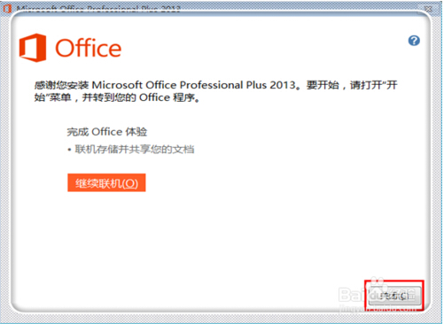 在20分鐘左右之后,安裝完畢,點(diǎn)擊右下角的“關(guān)閉”關(guān)閉安裝提示選項(xiàng)卡,這時候就成功安裝了microsoft office2013。