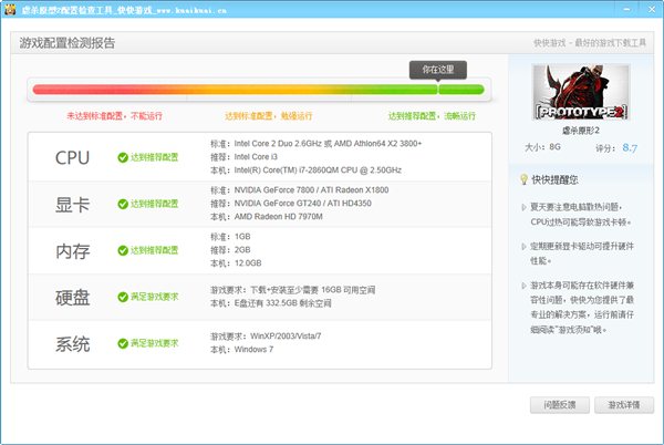 虐殺原形2配置檢查工具由多玩快快游戲制作發(fā)布的實(shí)用工具,不僅可以讓你立即了解自己電腦的游戲硬件配置詳情,更可以在1秒的時(shí)間內(nèi)就檢測出你的電腦是否足以迎接《虐殺原形2》的游戲內(nèi)容!簡單又方便!當(dāng)然,更是絕對無毒安全的。如果你對自己的電腦配置存在能否玩的了《虐殺原形2》的擔(dān)憂,強(qiáng)烈推薦大家用這個(gè)綠色小工具先來個(gè)自我檢測吧!