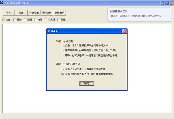 將手機(jī)號(hào)碼文件中的號(hào)碼按照移動(dòng)手機(jī)號(hào)碼,聯(lián)通手機(jī)號(hào)碼,電信手機(jī)號(hào)碼,其他手機(jī)號(hào)碼分類,并且可以選擇需要的號(hào)碼導(dǎo)出為txt文件。