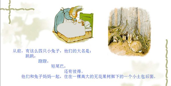 彼得兔的故事:從前,有這么四只小兔子,他們的大名是: 跳跳, 蹬蹬, 短尾巴, 還有彼得. 他們和兔子媽媽一起,住在一棵高大的無花果樹腳下的一個小土包后面....彼得兔的故事由(英)畢翠克絲·波特著