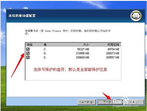 4、出現(xiàn)新的界面,在此界面是要我們選擇要保護(hù)的盤符,如果我們要保護(hù)C盤、D盤的話直接選中C、D盤就可以,此項默認(rèn)的是全部磁盤保護(hù)。選好后點擊“下一步”