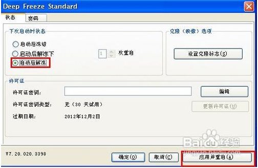 3、進(jìn)入界面之后,狀態(tài)選擇“啟動后解凍”,然后點擊“應(yīng)用并重啟”