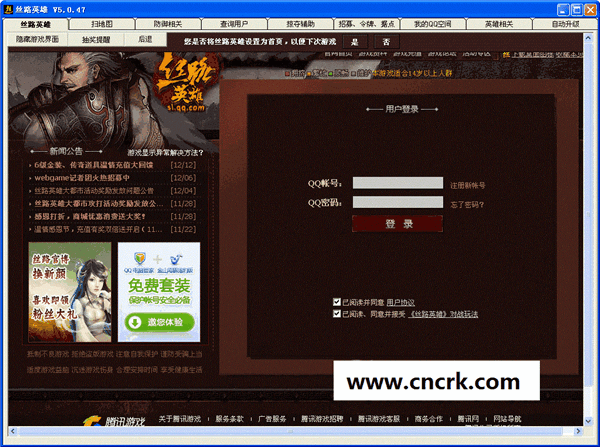 系鈴絲路英雄輔助是一款綠色、免費(fèi)的絲路英雄輔助。系鈴絲路英雄輔助工具主要功能有自動冒險,自動尋找死城坐標(biāo)插旗,掃描軍隊數(shù)量,財富,免費(fèi)休整,防御監(jiān)控,包括發(fā)送信息到您的手機(jī),自動修煉,查詢用戶QQ以及QQ查詢用戶游戲名稱,自動升級建筑等多個功能,并且完全免費(fèi)。