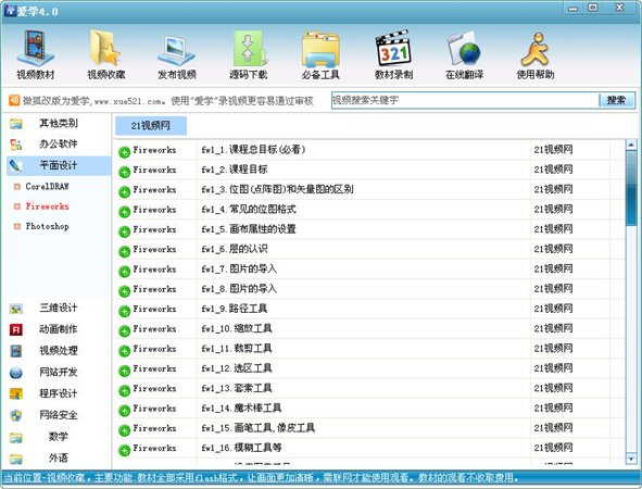 愛(ài)學(xué)教材全部采用flash格式的視頻,其特點(diǎn):體積小高清晰。目前內(nèi)容涵蓋:外語(yǔ),數(shù)學(xué),化學(xué),物理,辦公軟件,平面設(shè)計(jì),三維設(shè)計(jì),動(dòng)畫(huà)制作,視頻處理,web開(kāi)發(fā),程序設(shè)計(jì),網(wǎng)絡(luò)安全等視頻教材。為方便用戶快速查找與使用進(jìn)行了細(xì)微的分類(lèi),