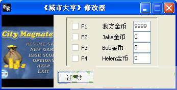 修改功功能: F1 我方金幣數(shù)量修改為指定的數(shù)值 F2 jake金幣數(shù)目修改 F3 bob金幣修改 F4 helen金幣修改