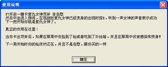 一鍵卡復(fù)仇女神雙斧使用稅用F7一鍵開啟卡復(fù)仇女神雙斧,然后中途進(jìn)游戲,在觀看復(fù)仇女神已經(jīng)變身的時(shí)候按E,聽到一聲女神的聲音表示成功。