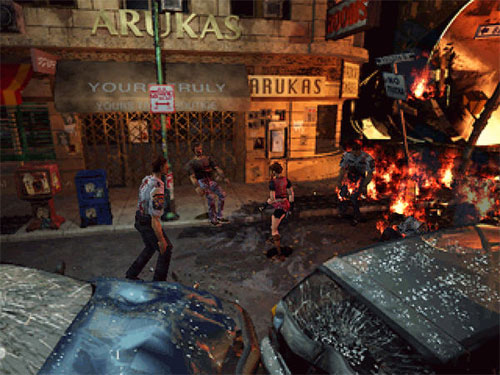 事到如今,只好硬著頭皮去面對街道上那些討人厭的僵尸。我拔出了槍,將街道上的僵尸解決后,進到了后巷內(nèi)的一間軍火用品店,一進門便讓我吃了一驚,只見軍火店的老板拿著散彈槍對我喊著 “別動!”。還好,既然還會講話那就不是僵尸。我問他這里究竟發(fā)生了什么事,不過他也不太了解。當我在店里休息時(到處走走,調(diào)查一下),突然,街上的僵尸破門而入!店長躲避不及而慘遭毒手,那畫面真是慘不忍睹。替店長報了仇之后,拾起他身上的散彈槍(調(diào)查兩次),心中暗自發(fā)誓,定要找出拉昆市發(fā)生異變的真相。從軍火用品店的后門出去,經(jīng)防火巷、籃球場、停車場等地,一路上都是愚蠢又討厭的僵尸。為了節(jié)省彈藥,我盡量閃躲僵尸前進,不再一一射殺。穿過了停車場的巴士,以及停車場的另一半?yún)^(qū)域,不一會兒就來到警察局的前庭。不知道克蕾兒此刻怎么樣了?