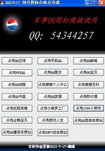 qq2012圖標(biāo)點(diǎn)亮器可以幫助大家自動點(diǎn)亮qq空間、qq寶貝、絲路英雄、3366小游戲等圖標(biāo),是一款集合了部分QQ圖標(biāo)點(diǎn)亮指引功能的綠色純凈輔助。