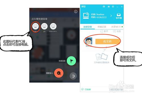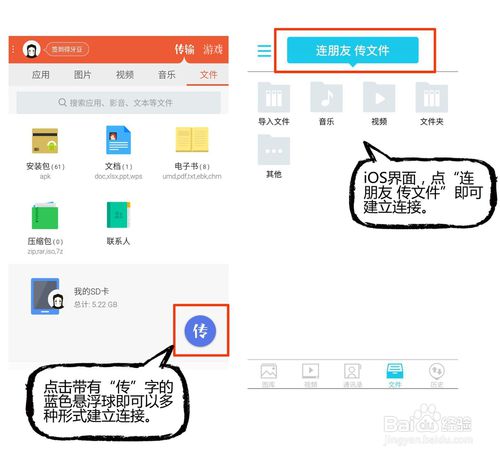 2.手機(jī)與手機(jī)用戶互傳文件,只要打開快牙登陸后創(chuàng)建連接即可。安卓用戶點(diǎn)擊右下方帶有“傳”字的藍(lán)色懸浮球,即可通過(guò)搜索加入、創(chuàng)建連接、快速連接建立聯(lián)系。蘋果用戶點(diǎn)擊頂端“連朋友 傳文件”即可搜索到附近朋友,建立連接。(添加手機(jī)互傳經(jīng)驗(yàn)鏈接,進(jìn)行引導(dǎo))手機(jī)間互傳