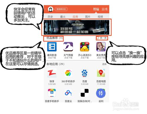 怎么發(fā)現(xiàn)新內(nèi)容?1.并非只在文件傳輸時(shí)才能用到快牙,快牙內(nèi)置了很多有趣視頻、精華應(yīng)用、熱門游戲以及達(dá)人號(hào)推薦的可供下載的眾多內(nèi)容資源等,是獲取多樣化資源的好地方。