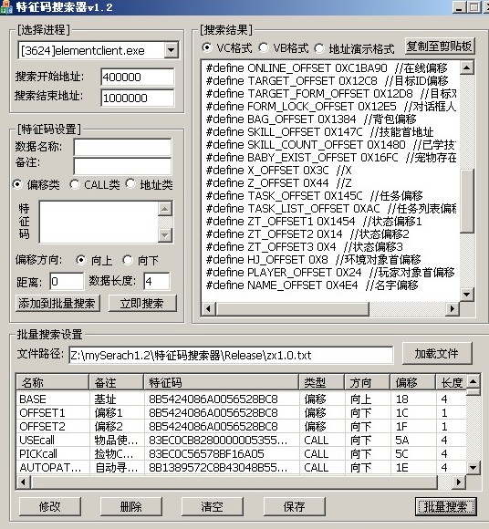 特征碼搜索器,可以搜索call,偏移,地址。詳細(xì)使用說明內(nèi)詳。VB,VC,地址查看三種格式輸出搜索結(jié)果,用來更新基址,十分方便。