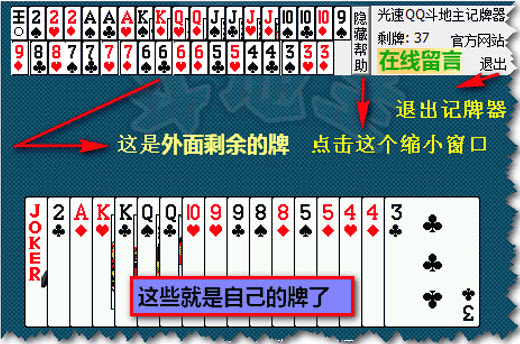 光速Q(mào)Q斗地主角色版記牌器,在點擊開始按鈕前打開記牌器,點擊游戲開始按鈕后,記牌器自動工作,中間不用退出記牌器,下一盤會自動開始記牌 ,記牌器的大小可以點擊隱藏幫助按鈕變小,還可以用鼠標拖動記牌器移動他的位置 。