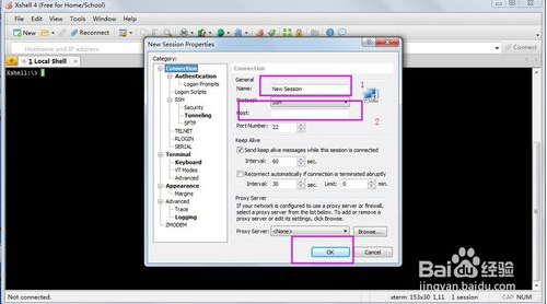 3 、點(diǎn)擊【New】后會(huì)彈出一個(gè)小的方框在最上層,方框名為“NewSessionProperties”意為新建一個(gè)會(huì)話連接,在下圖標(biāo)識(shí)的1的位置,輸入你為這個(gè)連接所賦予的名字,這里建議使用服務(wù)器的IP,因?yàn)檫@樣不會(huì)因?yàn)闀r(shí)間過(guò)長(zhǎng)而倒置忘記。在下圖標(biāo)識(shí)2的位置,host項(xiàng)填寫(xiě)訪問(wèn)主機(jī)的IP如“192.158.0.0”,然后點(diǎn)擊下方的【OK】按鈕