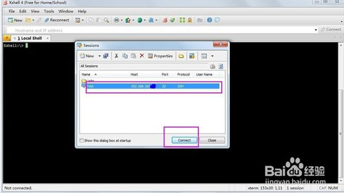 4、點(diǎn)擊后會(huì)出現(xiàn)一個(gè)新的方框,名為“session”會(huì)話,在這個(gè)會(huì)話窗口,看到了剛剛小編新建的一個(gè)主機(jī)連接,使用鼠標(biāo)左鍵點(diǎn)擊選中,然后點(diǎn)擊下方的【connect】連接
