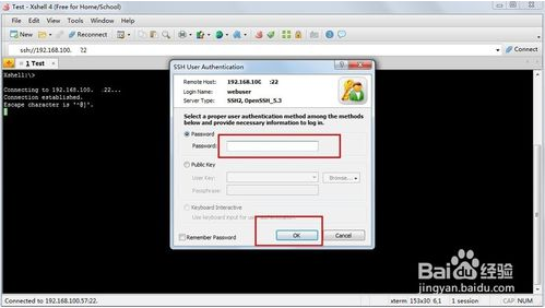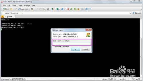 5、點(diǎn)擊連接后會(huì)出現(xiàn)一個(gè)新的小框“SSHUserName”意思就是用戶名,在下方的輸入框中輸入一個(gè)用戶名,如果經(jīng)常使用可以勾選下方的勾選框,記住這個(gè)username,然后點(diǎn)擊下方的【OK】按鈕