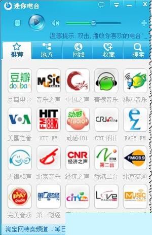 迷你電臺,體積小巧的網(wǎng)絡(luò)電臺。占用系統(tǒng)資源極低,可最小化到系統(tǒng)托盤中。您可以一邊聽廣播,一邊照常做其他的事情,絲毫不會受到影響。迷你網(wǎng)絡(luò)電臺匯集全球各地流行網(wǎng)絡(luò)電臺于一體,打開軟件,你可以看到該軟件以3個標(biāo)簽頁的形式顯示:推薦電臺、電臺大全、我的收藏。推薦電臺中有時下最流行的青檬音樂臺、完美音樂等,雙擊某個電臺即可快速播放,或按右鍵暫停、播放、停止、收藏。