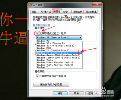 我們在“兼容性”選項卡中找到“以兼容模式運行這個程序”點擊它前面的小方框,然后選擇“windows xp (service pack 3)”,如圖;
