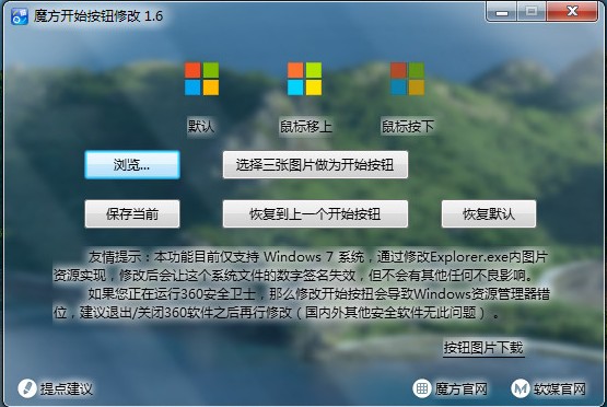 魔方開始按鈕替換工具,一看就會,方便你的按鍵修改。微軟更換了新的logo,用膩了windows 7開始按鈕圖標的朋友也嘗試著更換一下口味。改成Windows 8的,改成你的照片,你的女友或男友的照片,你的孩子的照片,改成一個卡通動漫人物,或者把別人的開始按鈕惡搞成一個豬頭、一個骷髏……或者全空白!