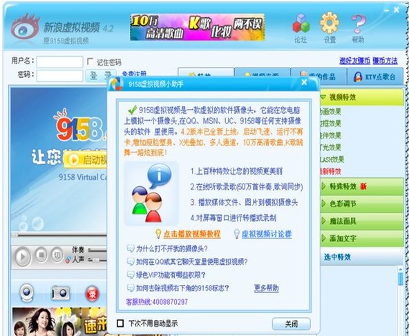 9158虛擬視頻官方下載是一款虛擬的軟件攝像頭,適用于可視頻聊天的所有軟件(QQ、MSN、UC、9158聊天室等),外掛上百種特效,可對(duì)屏幕進(jìn)行轉(zhuǎn)播或錄制,集聽(tīng)歌、錄歌、播放視頻圖片于一體,收錄10萬(wàn)首最新、最全的高質(zhì)高清歌曲,是網(wǎng)絡(luò)上最大的大眾娛樂(lè)K歌軟件!另外9158虛擬視頻官方下載軟件還與9158多人視頻網(wǎng)站互動(dòng),只需免費(fèi)注冊(cè)一下,就能輕松擁有在線拍照、視頻相冊(cè)、視頻游戲等9158的所有功能。