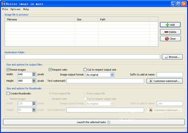 Resize image in mass是一款可以批量對圖片添加水印的工具,該工具可以幫助用戶一次修改大批量圖片的寬度高度、尺寸、比例,還可以批量添加水印、創(chuàng)建縮略圖等。