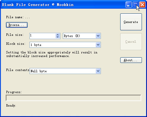 Blank File Generator可以生成一個(gè)空白或隨機(jī)文件中任何范圍從 1 個(gè)字節(jié)到 256 MB的空白文件可寫(xiě)或可移動(dòng)驅(qū)動(dòng)器上。用戶可以指定文件的大小和數(shù)據(jù)塊大小。