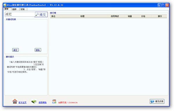 淘寶排行榜工具是一款綠色的小軟件,目前包含搜索、趨勢(shì)和定制三個(gè)功能模塊。搜索模塊是基于關(guān)鍵詞查詢并自動(dòng)生成的排行榜工具,趨勢(shì)模塊是一個(gè)以淘寶網(wǎng)購(gòu)物流行趨勢(shì)為導(dǎo)向的一個(gè)關(guān)鍵詞排行榜,定制模塊可以定制你關(guān)注的商品分類(lèi)的銷(xiāo)量排行榜或者上升速度排行榜。淘寶排行榜工具是基于關(guān)鍵詞查詢并自動(dòng)生成的排行榜工具,數(shù)據(jù)來(lái)源淘寶網(wǎng)官方準(zhǔn)確可靠,杜絕人為干預(yù)帶來(lái)的不利影響;以客戶端形式展現(xiàn)淘寶銷(xiāo)量、信用及價(jià)格排行榜,響應(yīng)速度更快,查看更為方便直觀,為您帶來(lái)別樣的網(wǎng)購(gòu)體驗(yàn)。