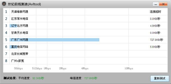 世紀網(wǎng)速測試器 綠色版 世紀網(wǎng)速測試器是一款可以測試寬帶網(wǎng)速,支持電信、網(wǎng)通、移動。世紀網(wǎng)速測試工具使用簡單,點擊【開始測試】按鈕就可以??梢酝ㄟ^ FTP 協(xié)議,測試出連接8種不同提供商服務器的速度。測試數(shù)據(jù)全部在內(nèi)存中進行,不會向磁盤寫入文件。X 軸的顯示單位是比特率,不要把它當成下載速度。