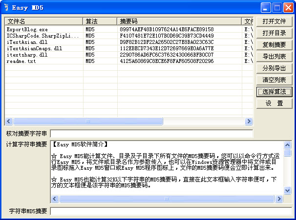 ☆ Easy MD5能與fsum.exe程序配合,以MD2、MD4、SHA1、SHA256、SHA384、SHA512、RMD、TIGER、PANAMA、ADLER、CRC32、EDONKEY算法計算文件的摘要碼,點擊選擇算法按鈕可打開選擇算法對話框,打開文件時按住Shift鍵也可以打開選擇算法對話框。