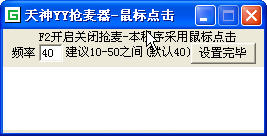 天神YY搶麥器是一款YY輔助工具,幫助你一鍵搶麥。支持所有YY版本。軟件采用的是鼠標連點功能!上麥成功率高于80% ,默認的按鍵頻率為40MS!最低可設(shè)置為10MS!熱鍵為F2!搶麥時將鼠標放到搶麥的按鈕上然后按下F2!即會自動點擊搶麥按鈕!直到再次按下F2后方會停止 。