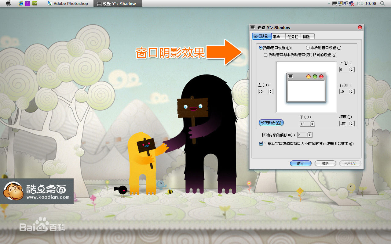 窗口陰影酷點桌面窗口上具有凸顯立體感的陰影,只需要輕輕的點擊下開啟窗口陰影效果,窗口馬上陰影起來。還可方便調(diào)整陰影顏色、濃度等等 。該插件還有以下功能:1、調(diào)整投影顏色;2、針對任務欄投影設置;3、鼠標右鍵菜單的投影設置;4、可以指定排除不需要投影的窗口;