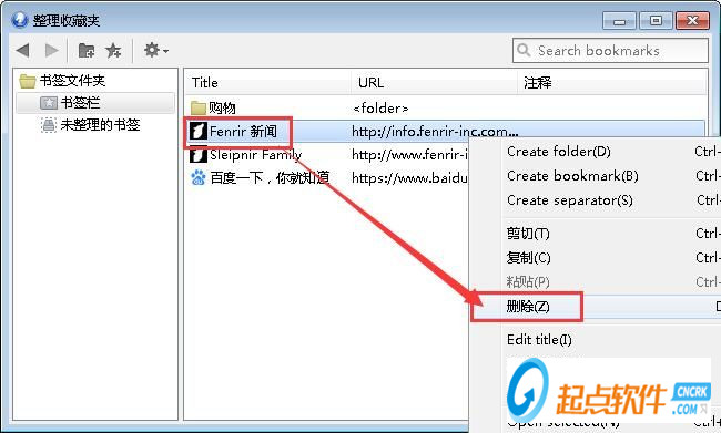 在整理收藏夾窗口中,找到用不上的網(wǎng)頁書簽,選中書簽之后用鼠標(biāo)右鍵點(diǎn)擊書簽,打開書簽管理菜單。點(diǎn)擊菜單中的刪除,就可以將選中的書簽從瀏覽器中刪除;