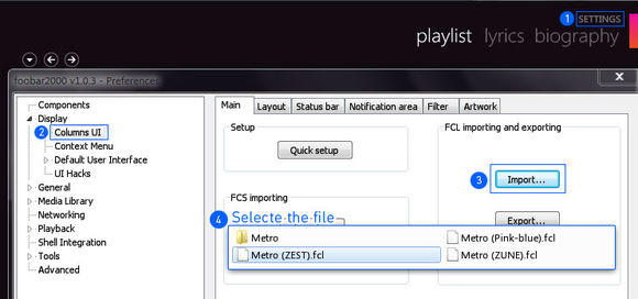 6.無視本圖圈1 還是在左上角選擇files-preferences出現(xiàn)此對話框 從圈2開始(此步是導(dǎo)入配置文件) ------.fcl 是配置文件 圈4從3個文件3選1 只是背景顏色不一樣 可以試下喜歡哪個