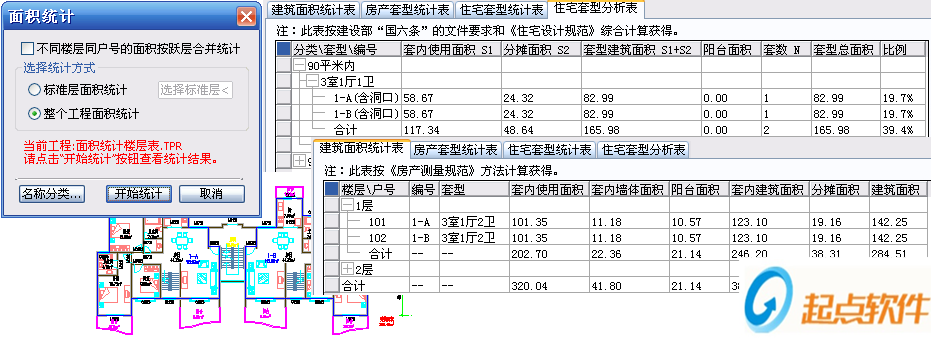 3.全面改進(jìn)的面積查詢統(tǒng)計(jì)功能及房間面積對(duì)象,可按《住宅建筑設(shè)計(jì)規(guī)范》以及建設(shè)部限制大戶型比例的有關(guān)文件統(tǒng)計(jì)住宅的各項(xiàng)面積指標(biāo),自動(dòng)生成相應(yīng)表格,用于設(shè)計(jì)審查報(bào)批。