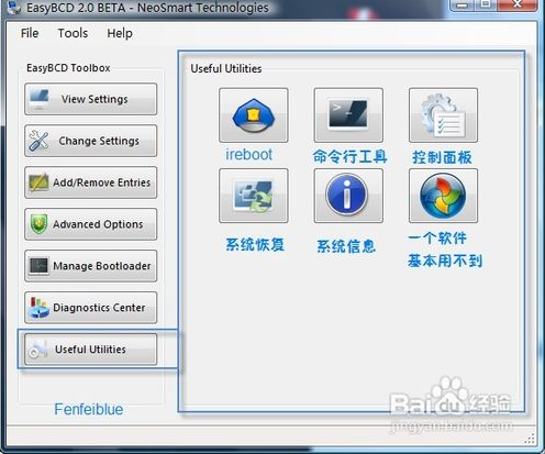 命令行工具會(huì)打開(kāi)cmd,并前往到軟件bin目錄。然后是系統(tǒng)的控制面板,系統(tǒng)的恢復(fù)界面(必須備份過(guò)系統(tǒng)才能用)系統(tǒng)信息(這三個(gè)都是系統(tǒng)的功能,而不是easybcd提供的功能)最后是個(gè)優(yōu)化軟件,沒(méi)用過(guò)。