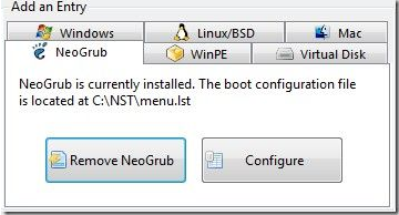 8.這里添加mac啟動(dòng)項(xiàng),有兩種方式,EEI和MBR。EFI方式會(huì)使用easybcd自帶的引導(dǎo)工具,使用efi方式會(huì)提示卸載NeoGrub。切換到NeoGrubREmove即可(沒(méi)安裝過(guò)的沒(méi)問(wèn)題)單擊Configure可以看到efi方式用的是NST_OS_X.iso來(lái)引導(dǎo)macos,(NST_OS_X.iso這個(gè)就是變色龍rc3,可以引導(dǎo)snow)MBR方式只是來(lái)尋找hfs分區(qū)的boot1h,類似于tboot,所用的引導(dǎo)文件是需要自己安裝這種方式好像已經(jīng)不適用新版的變色龍和pcefi了(mac引導(dǎo)方式是:boot0》boot1h》boot,tboot相當(dāng)boot0,boot就是變色龍或pcefi的主文件。boot1h是hfs分區(qū)的引導(dǎo)代碼,如果他錯(cuò)誤就會(huì)提示上面的HFSPartitionError)。