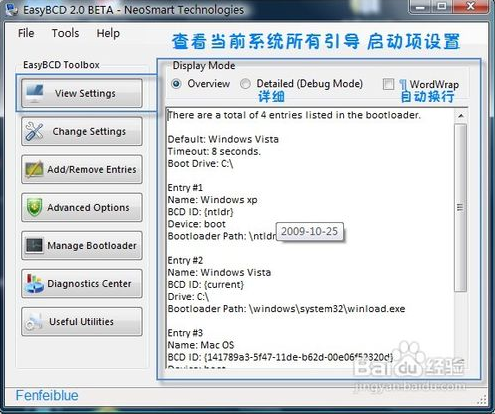1.打開(kāi)EasyBCD默認(rèn)顯示的是ViewSetting,可以查看當(dāng)前所有的啟動(dòng)項(xiàng)信息。