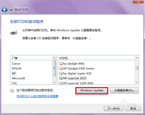此步,如果廠商中沒有出現(xiàn)hp,那么需要先點擊“windows update”,等待一會兒,就會出現(xiàn)相應廠商。