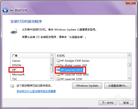 由于hp LaserJet 1010不支持win7(同時這個版本也沒有顯示出來),所以在此我們選擇“hp LaserJet 1015”,如紅色框標記所示,然后點擊“下一步”。