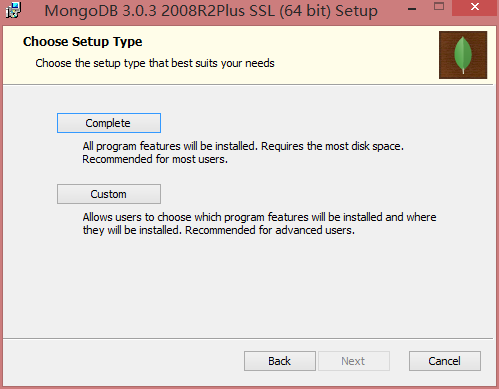 4.第一個(gè)選項(xiàng):Complete(完整版),默認(rèn)安裝所有功能到C盤;第二個(gè)選項(xiàng)Custom(自定義),可以選擇安裝目錄與服務(wù)。這里選擇Custom: