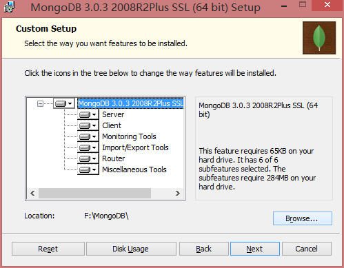 5.默認(rèn)全部功能安裝,選擇Browse更換安裝目錄到F:\MongoDB(自己選擇、)下,Next,然后選擇Install開始安裝: