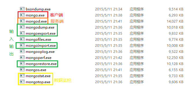 7.打開MongoDB目錄下的bin文件夾,會(huì)看到很多exe可執(zhí)行文件: