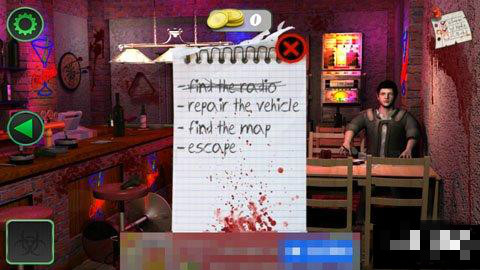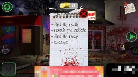 點(diǎn)擊屏幕右上角的紙條,上面有四行英文,大概意思是:尋找收音機(jī),修好出租車,找到地圖,逃生。這就是游戲的主線任務(wù)。所以我們的第一步就是要先尋找收音機(jī)。進(jìn)入游戲,最好四處查看一下地形,可以看出主要分為酒吧、垃圾箱、槍支商店、馬路、警察局和便利店(超市),以及外面的三輛車和一輛摩托車。